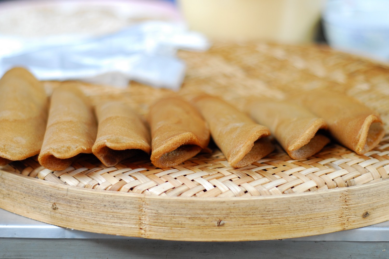 “调羹汤饼佐春色,春到人间一卷之。”时值立夏,薄饼摊旁排起了长长的队伍,等着刚“甩”出炉的薄饼皮。上等面粉制成的面浆烙成圆状的薄饼皮,透着质朴的香气,一张一张地层叠在一起。买回家后,取饼皮平铺桌上,然后添加喜欢的馅料,或是捣碎的花生酥加白糖,或是将肉丝、蛋丝、韭黄等混搭。取适量堆在面皮上理成一畦土垅,两段收口,如卷纸一般卷起即可稳稳地兜住馅料拿在手上享受美食,形似春卷却不油炸,犹如书卷的薄饼给人们带来了餐桌上美的享受。