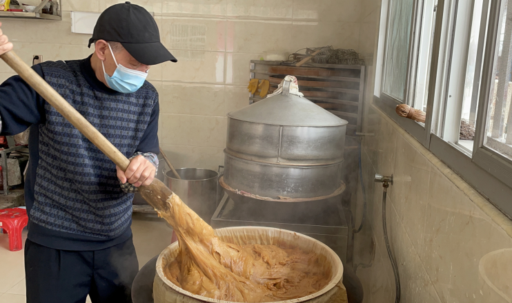 “蒸”甜粿,讲究的是火候,等待的是时光,守护的是诚心。时间越长,做出来的甜粿颜色越红亮,油油润润香气四溢。在蒸甜粿的七个小时里,需要搅拌五次,朱旺全老伯随身携带一个小本子,细细登记每一次的时间,他打趣道,人上了年纪,需要记录每一次的时间才不会忘记。第一次搅拌时间到了,朱旺全老伯拿下塞在边缝的湿布,掀起大锅盖,拿起了他的“宝贝”——船桨开始搅拌,少年时是赛龙舟主力的他,现在化身为“船夫”,“掌舵”着手中的美食,他说:“这根船桨经过改造,削掉部分让它更适合搅拌,比一般的工具能更好地混合搅匀。”