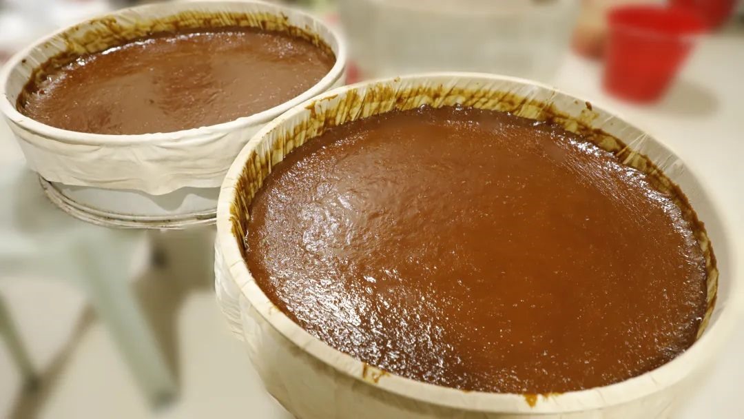 经过七个小时的慢熬,甜粿修成正果,热气腾腾的粿香在揭盖的刹那间隐隐袭来,馋嘴的小孩都恨不得扑上去啃上一口。只见甜粿表面“麻印”遍布,色泽黝黄,莹莹发亮,那是上好的表现。甜粿存放时间越长它越硬,回温后恢复黏糯原状,隔两天才可以冷却成型。吴色云说道:“开甜粿是个巧活儿,将放置两天的甜粿倒扣在桌子上,淋上开水才可以顺利将布膜取下,不然黏糊糊的。”