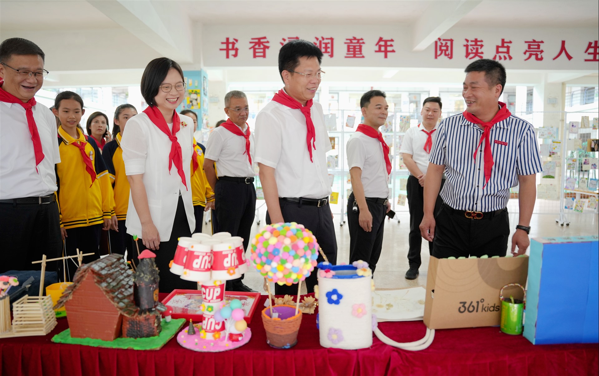 走进第三实验幼儿园,蓝良木实地察看了校园环境,不时俯身与正在参加幼儿社团活动的孩子互动交流,饶有兴致地观看师生精心排演的节目,与大家一同分享节日喜悦。随后,蓝良木一行前往实验小学,刚到门口,少先队员们便围拢上前,为他们系上鲜艳的红领巾,致以少先队队礼。在这些红领巾“小导游”的带领下,蓝良木参观了学校美育成果展区的学生手工作品,走进潮剧演出、童声合唱等特色文化课堂,为同学们饱满的精神风貌点赞。