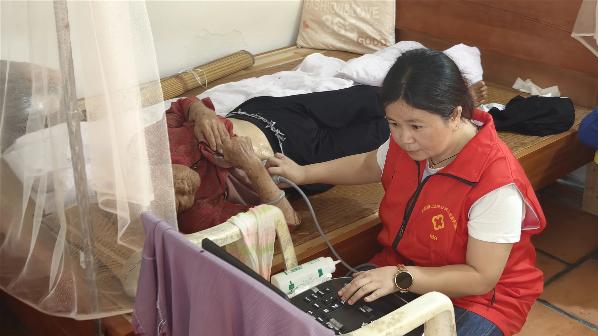 在家庭医生团队队长的带领下,医护人员熟练地为老人们进行心电图、腹部B超、血尿常规等多项检查,详细了解他们平时生活、饮食习惯,为其有针对性地开展健康促进工作,并为老人及其家人科普安全用药等健康知识。“老人家这个年纪出门不方便,你们能上门来给他做这么详细的体检,真的是太感谢了!”家属握着医护人员的手连连感谢。