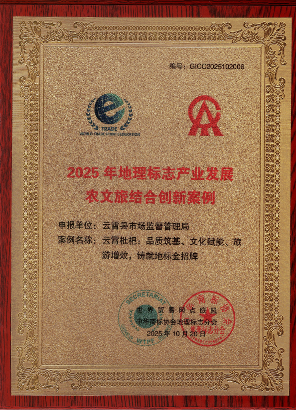 10月20日,由世界贸易网点联盟、中华商标协会联合主办的第十届世界地理标志品牌分销服务大会在北京举行,该会是世界地理标志领域具有重要影响力的高端交流平台。云霄县报送的《云霄枇杷:品质筑基、文化赋能、旅游增效,铸就地标金招牌》获评“2025年地理标志产业发展农文旅结合创新案例”,集中展示云霄县地标一二三产业实践发展成果,是专题案例类全省唯一入选案例。