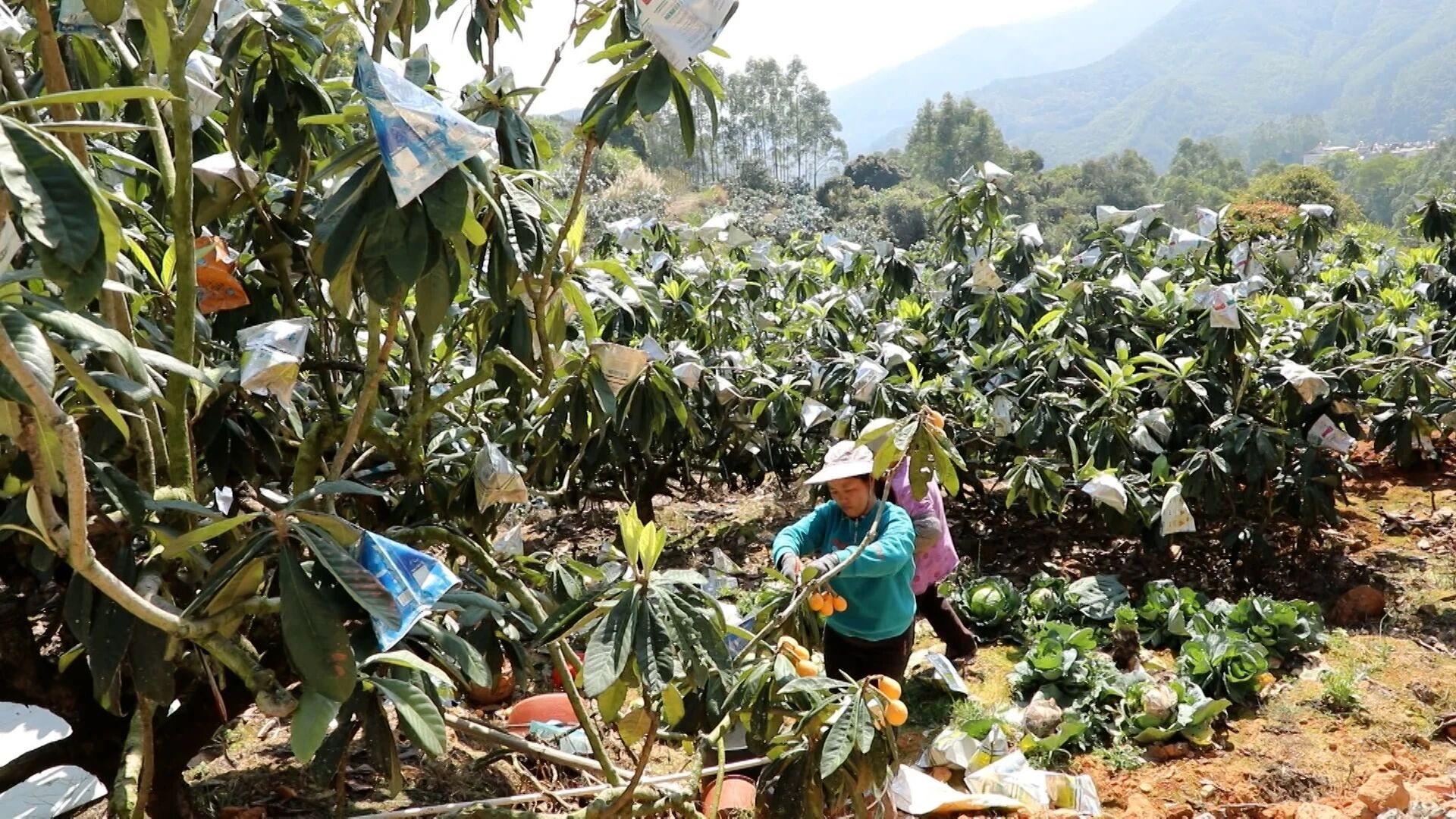 果农们熟练地采摘着成熟的枇杷,田间地头一派丰收美景。