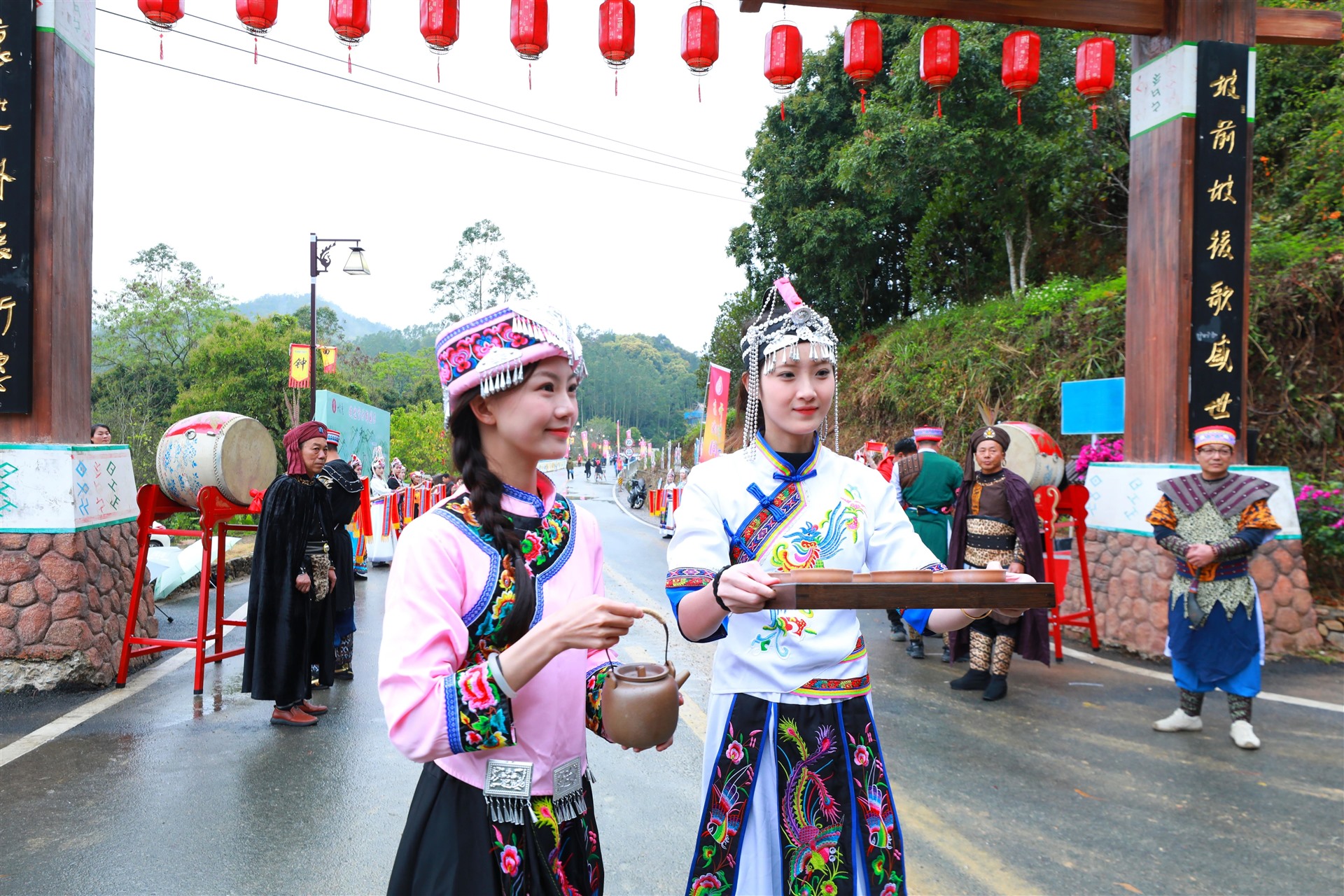 穿过富有畲族特色的寨门,时空的褶皱在此舒展。身着百褶凤凰装的畲族青年踏着《迎宾调》跃动而出,银饰碰撞声如清泉击石,裙裾翻飞间似彩凤临凡。“山哈青年”捧出的迎宾茶汤色澄碧,轻呷一口便觉千年茶韵直抵心扉。沿途漫步,廊桥对歌余音绕梁,竹竿舞步叩击大地,六福酒香漫过酒坊,祈福木牌随风轻响,见证着古老畲村的时代新生。