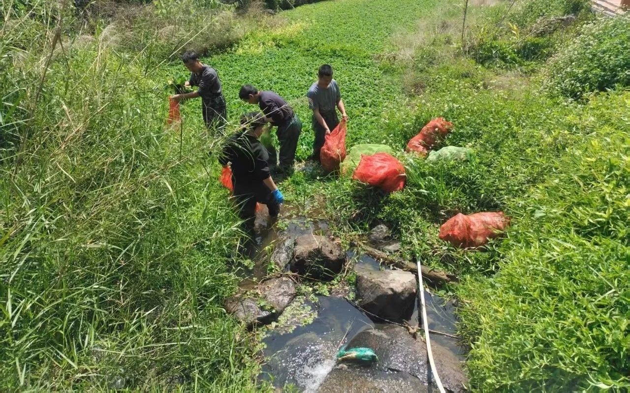 在下城村的小河滩上,身着防水服的村干部正将成片的水葫芦推向岸边,河岸上,村民自发组织清理陈年垃圾,并协助村干部转运河面废弃漂浮物,确保河畅水清岸绿景美。