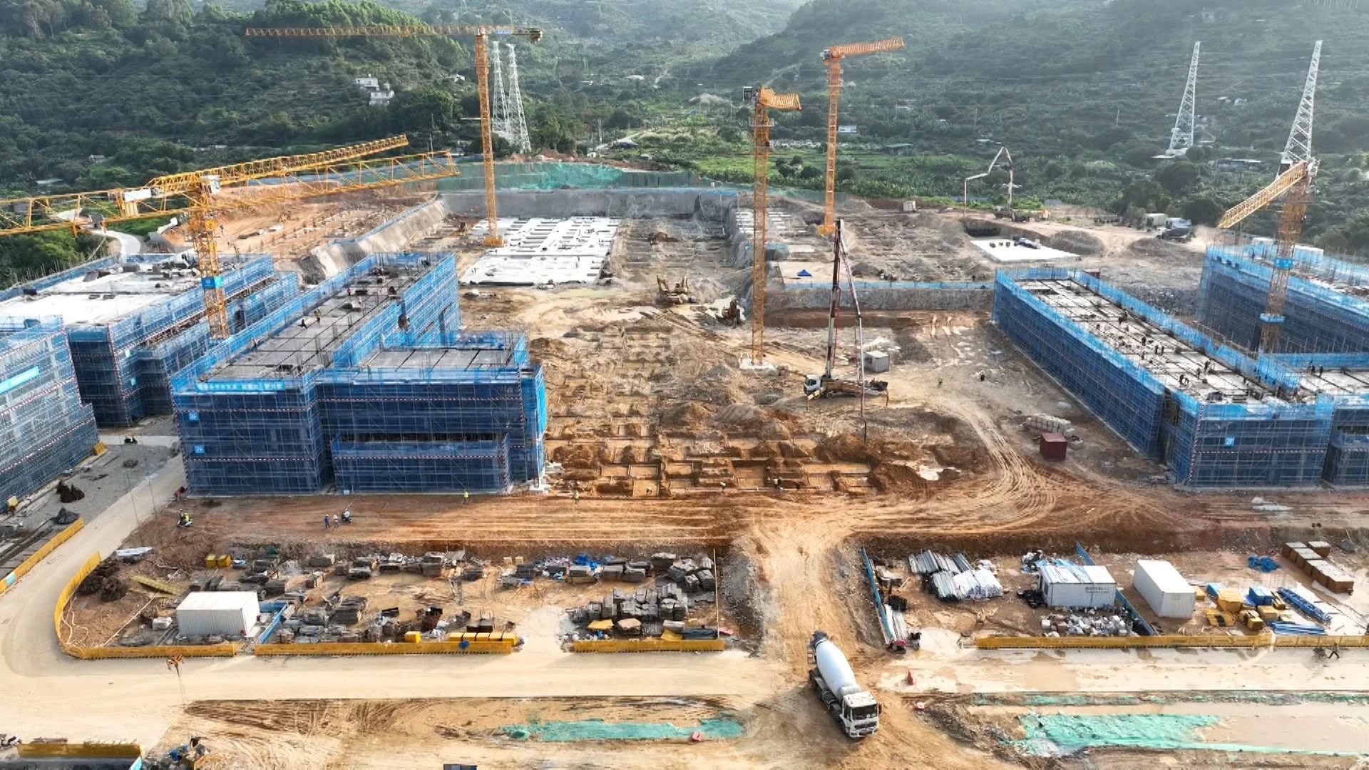 在云霄一中新校区迁建项目施工现场,塔机林立,机械轰鸣,呈现出一派忙而有序的建设场景。一栋栋教学楼已初见雏形,框架结构清晰可见,工人们正按照建设计划有序施工。