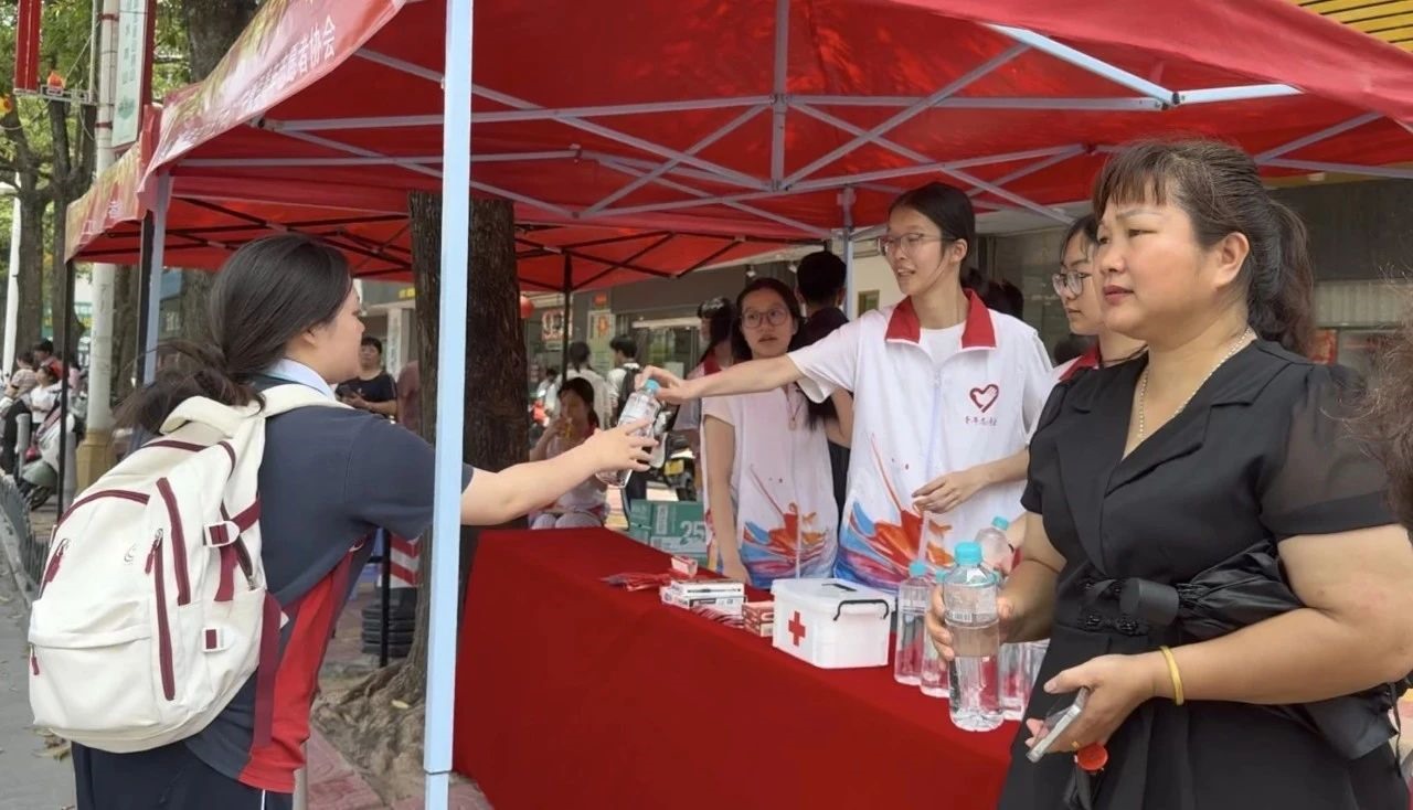 启飞社工延续“驿站+流动服务”模式,在考点外搭建了遮阳棚,配备应急文具、防暑药品、饮用水等物资,并邀请专业心理咨询师驻点提供现场心理疏导服务。