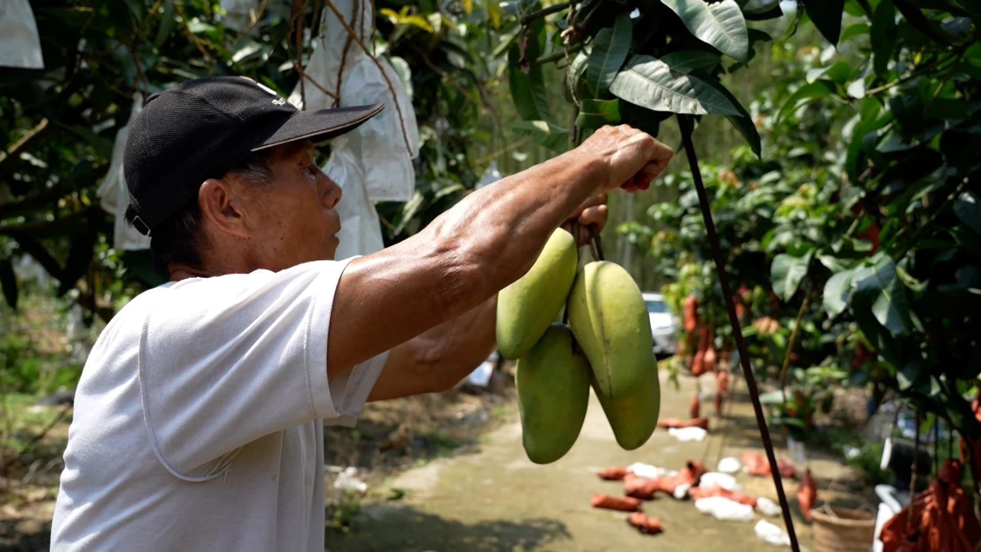 “我种的芒果有两个品种,一种是原始的阿里山‘红贵妃’,另一种是‘金煌’,‘金煌’的产量非常多,一棵树可以结果三百到四百斤。我的芒果基地面积30亩左右,一年的产量可以达到七万斤左右,目前有四万斤还没采摘,可以再采摘一个月。”手里的采摘动作不停,果农林森溪热情地介绍道。