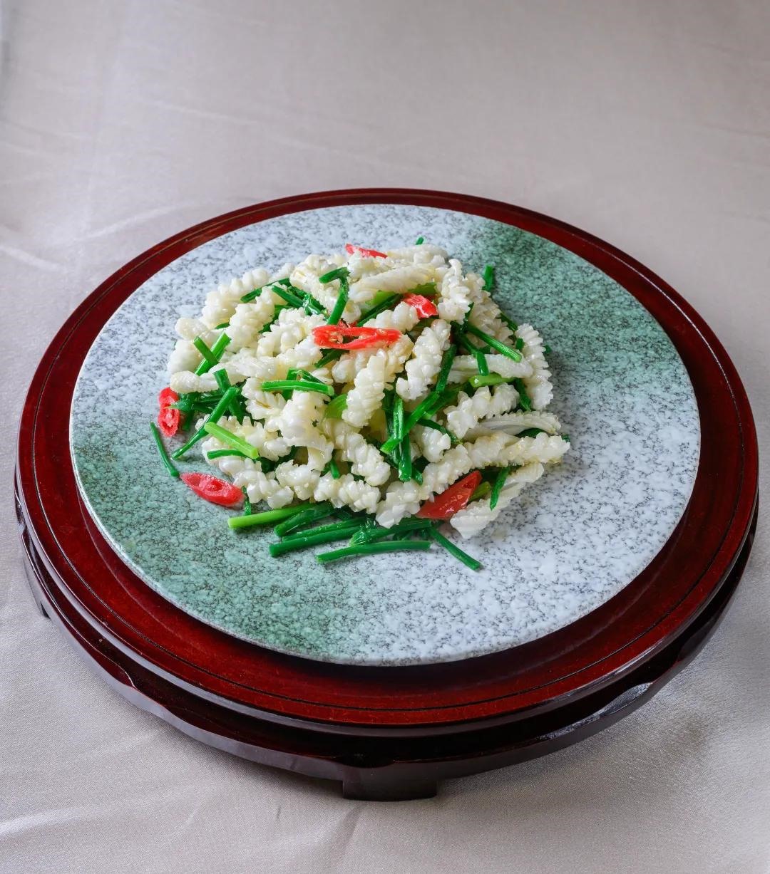 此菜为盛宴之雅致甜品。马铺淮山质地绵密细腻,象征着根基厚实的何地(马铺地名);洁白清甜的鲜百合瓣,层层绽放,宛若花朵盛开,寓意和谐与纯洁;而点睛之笔,是淋上金黄桂花蜜后,顿时香甜馥郁,光华流转。三者交融,口感清甜软糯,香气沁人心脾。此菜取山药的“山”、百合的“合”之音,冠名“山河锦绣”。这既是对开漳先贤披荆斩棘、开创漳州如画江山的崇高致敬,更是对今日国泰民安、物阜民丰、生活甜蜜的美好画卷的深情描绘。轻尝入口,甜在舌尖,既告慰先辈伟业,又礼赞盛世繁华。