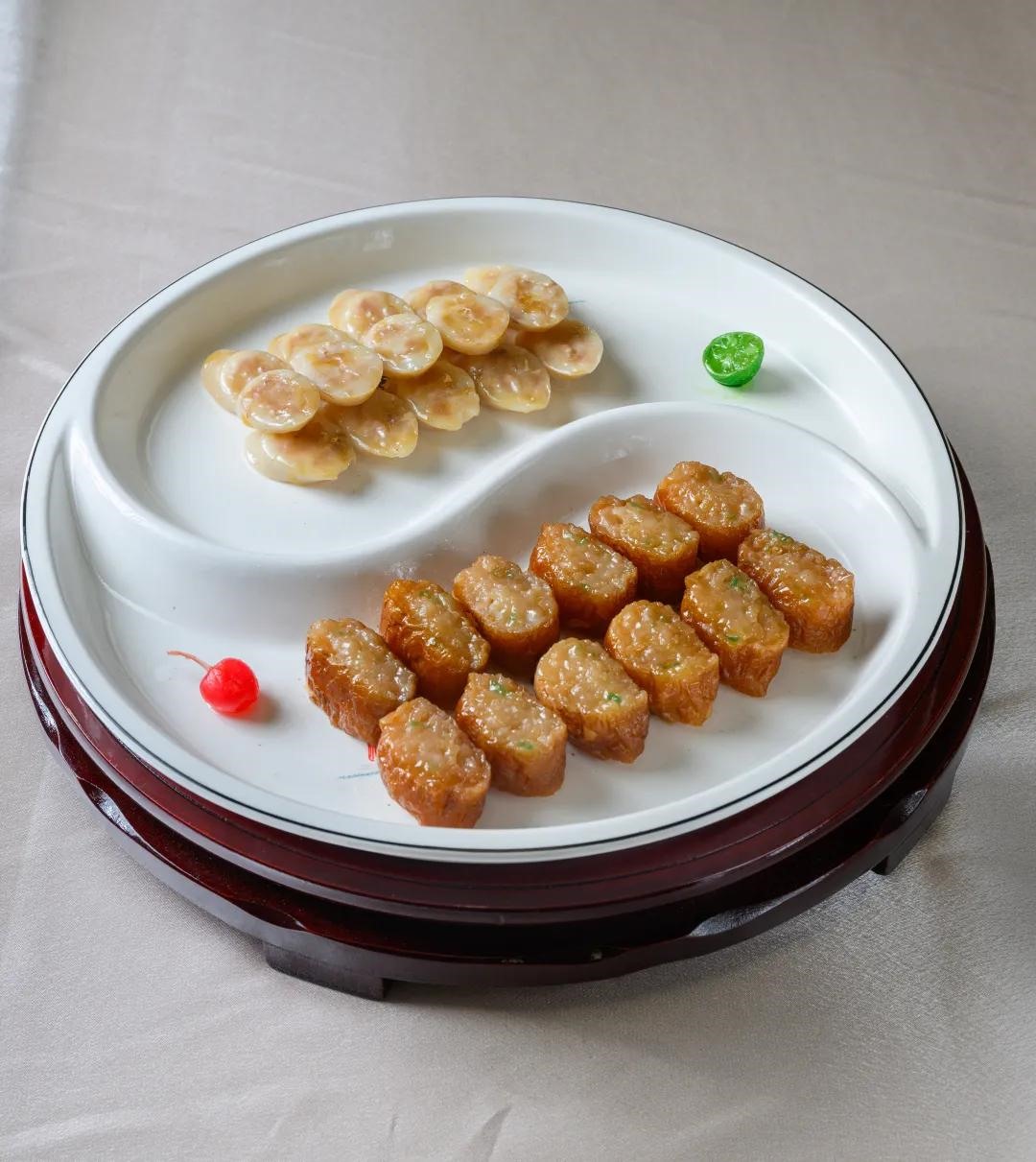 “燕翼”语出《诗经》,意为善为子孙谋划。云霄燕翼宫系朝廷允准陈元光将军赐建的宫宅。陈元光依托燕翼宫治理漳州,开创了闽粤安定繁荣局面。此菜精选烟肠与肉管(五香卷)拼盘而成,属云霄两大经典美食。烟肠以猪小肠灌入猪肉丁、地瓜粉等精制,口感扎实,寓意开漳先贤兴办书院、推行教化、启迪民智的深远谋划的文治;肉管(五香卷)以豆腐皮包裹笋丁或萝卜丝、肉末、葱花等馅料,油炸至金黄色,酥脆美味,象征开漳将士勇武刚毅与戍边卫土的武功。这一文一武双味并陈,谓之“燕翼双飞”,寄托开漳先辈以文治武功开创基业、积德贻谋之深意,也象征开漳文脉刚柔并济、文武兼修的精神传承。