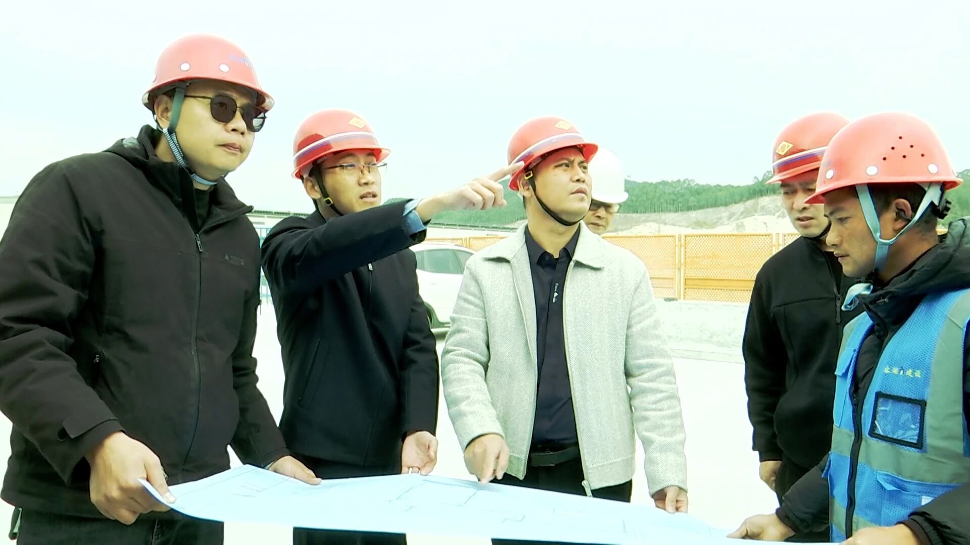 列屿镇工作人员与企业项目的施工队研讨项目一期建设规划方案